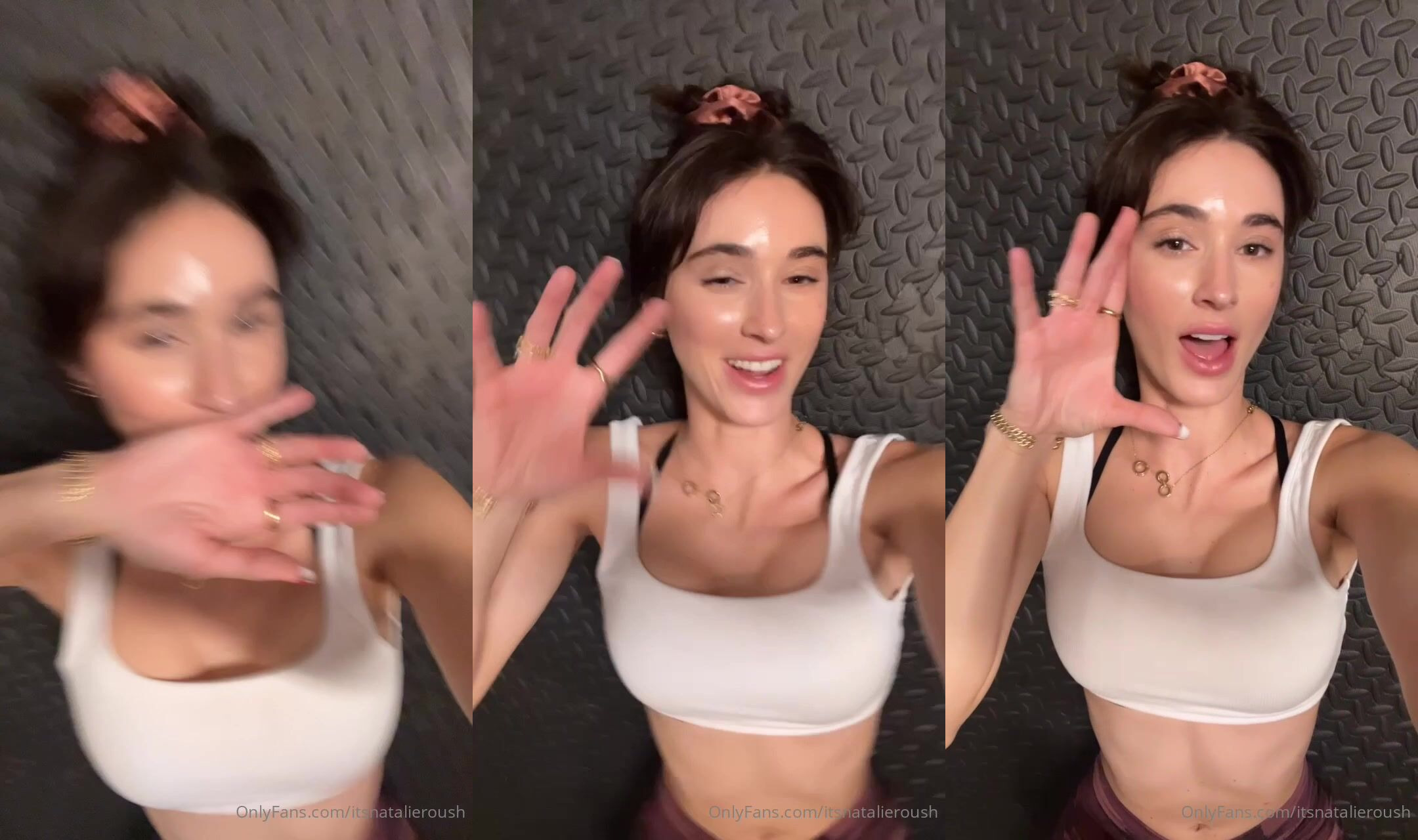 "Hot brunette itsnatalieroush flaunts her curves in a white sports bra"