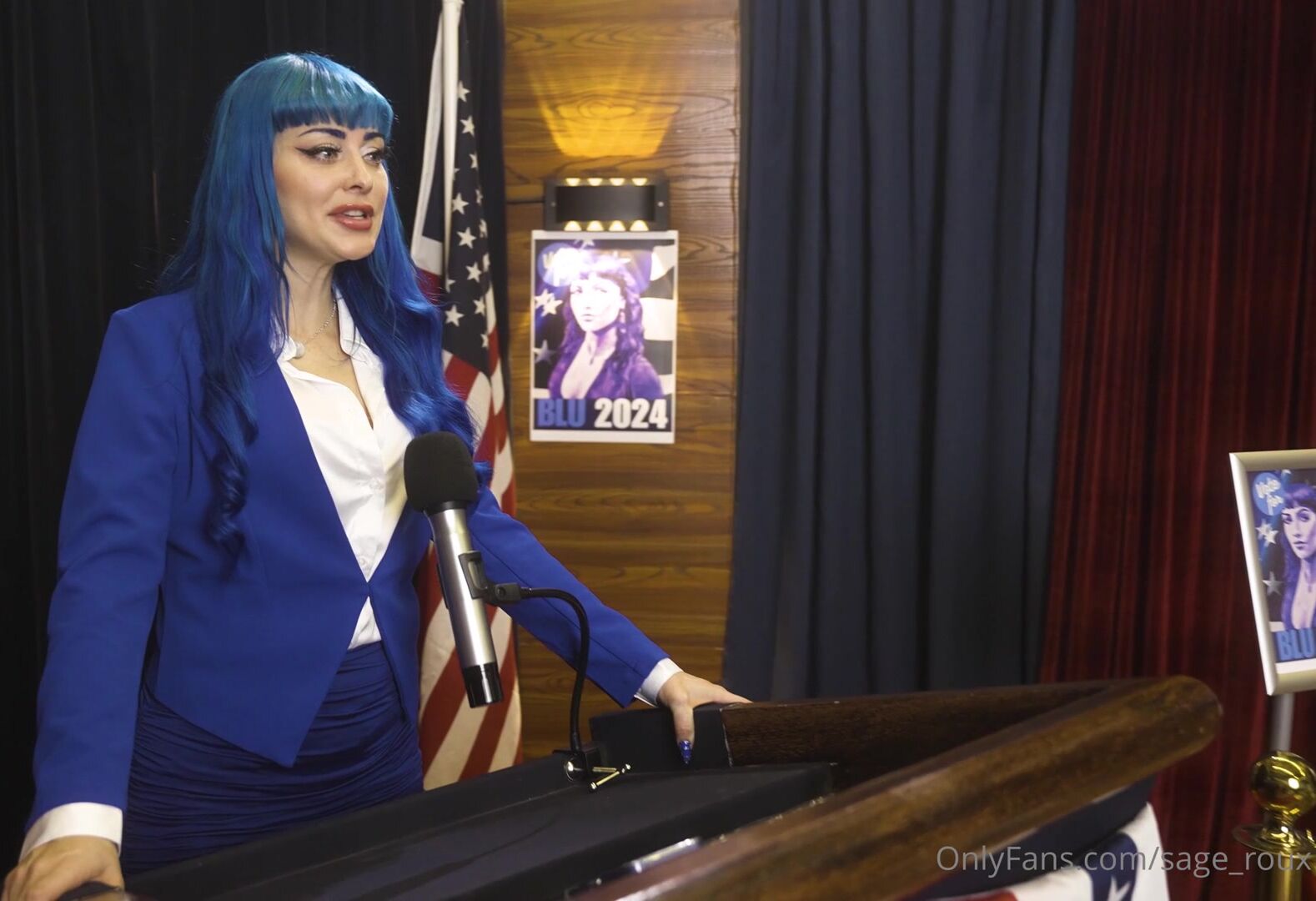Description: Blue-haired OnlyFans sensation jewelzblu stars in a steamy political-themed video, starting with a tease in a tight blue suit before stripping down to give a sloppy blowjob and riding cock in a wild session.