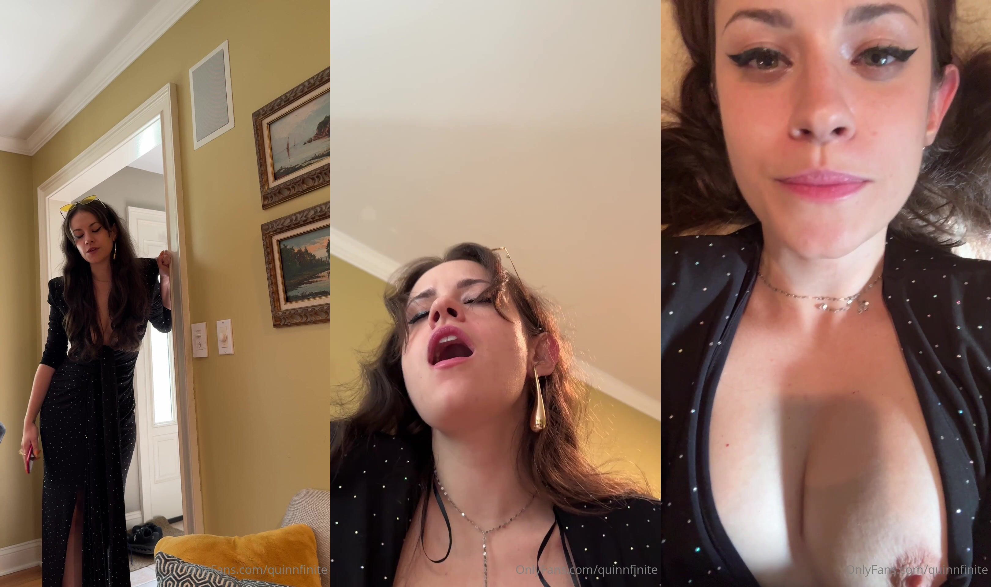 Spicy video with Quinn Finite showing off her curves in a black dress and teasing with her cleavage on full display.