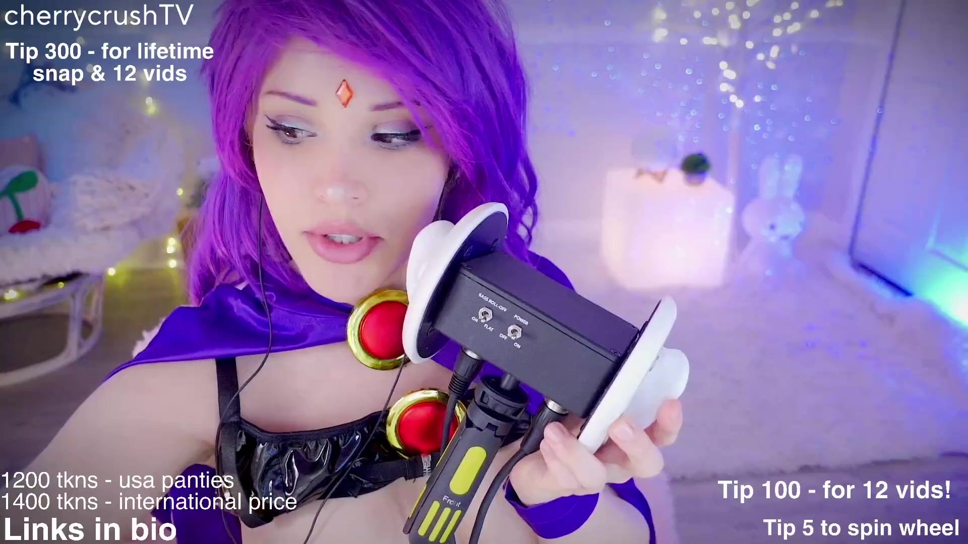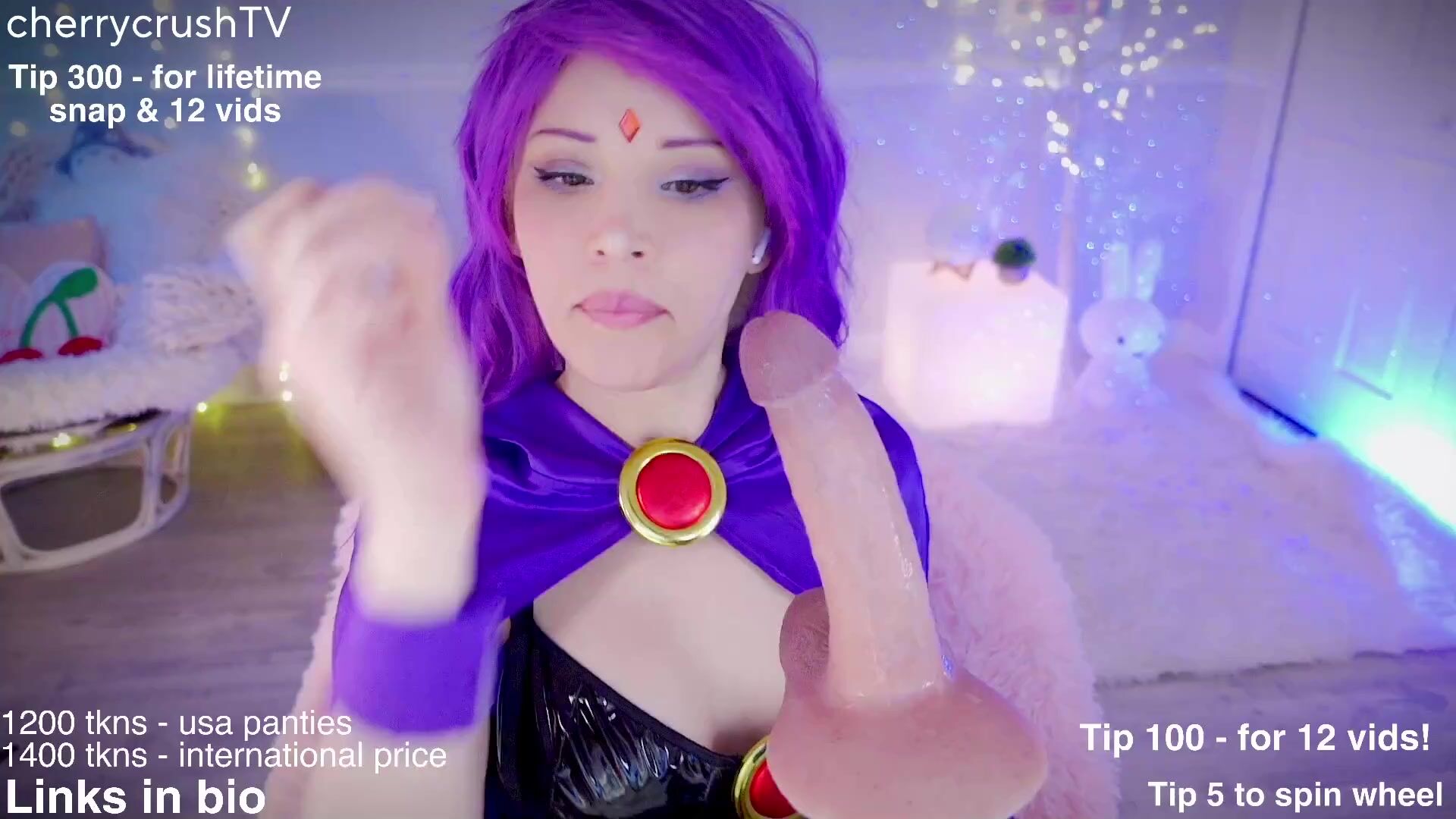 CherrycrushTV brings all your cosplay fantasies to life in this hour-long live stream video. Dressed in purple lingerie and thigh-high boots, she teases her big boobs and plays with her toys while interacting with fans.