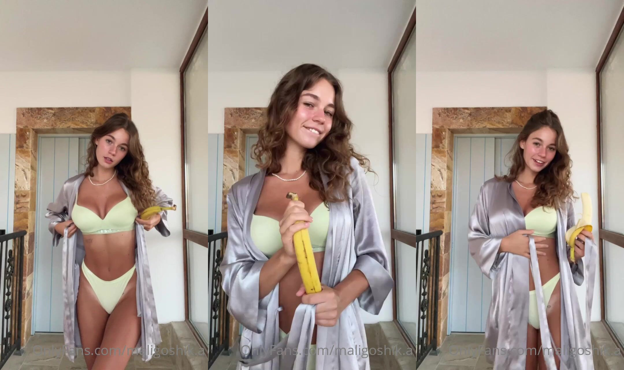 OnlyFans Anna Malygon Playing In A Lime Green Bikini And Grey Silk Robe Playing With Banana