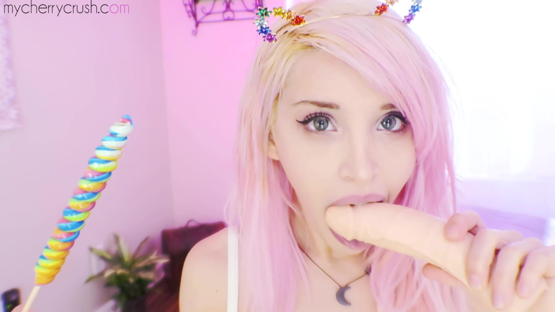 Cute pink-haired MyCherryCrush play with a lollipop and toys her pussy with a dildo in this playful solo video.