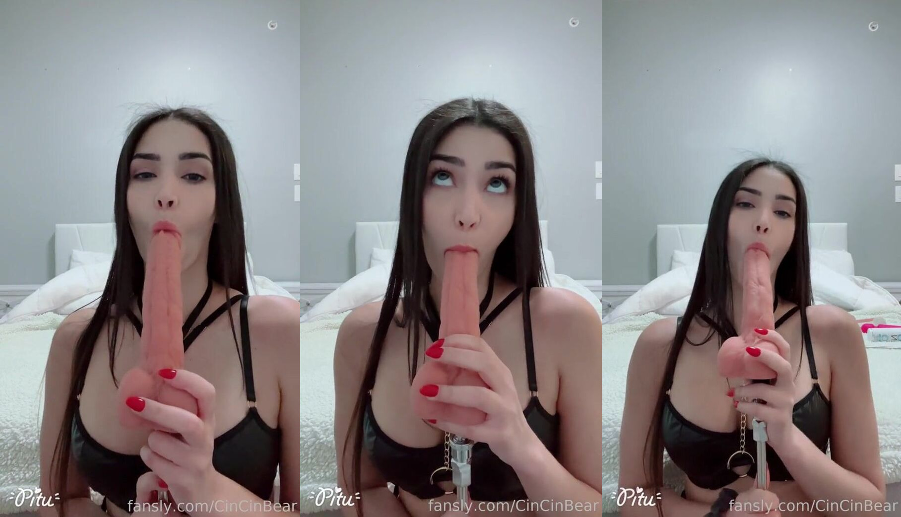 CinCinBear teases with a POV dildo blowjob in this seductive Fansly video, rocking black lingerie and making it steamy.